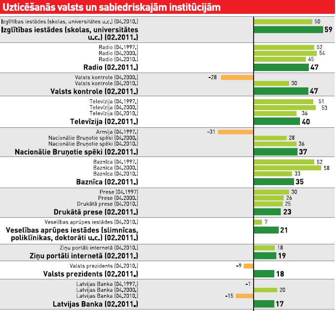 Pēc Neatkarīgās pasūtījuma tirgus un sabiedriskās domas pētījumu centrs SKDS veica aptauju (2011. gada 17. februāris – 3. marts) par sabiedrības uzticēšanos institūcijām un politiķiem.