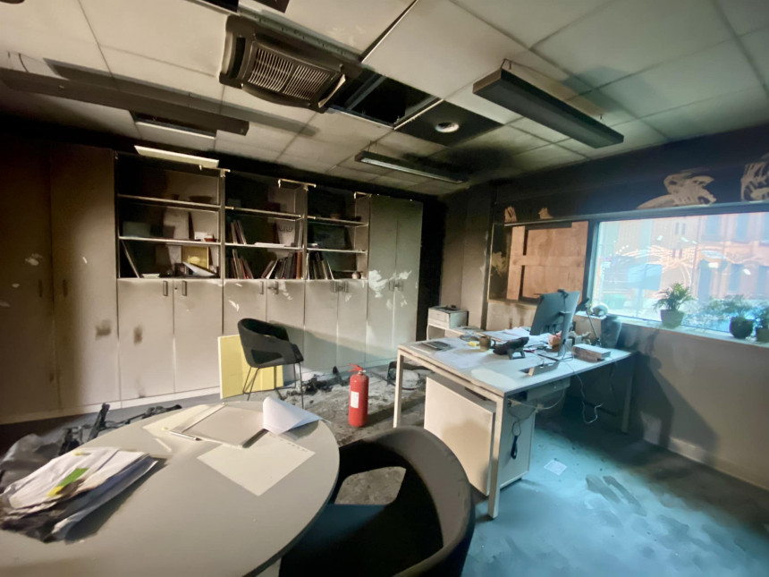 Valsts ugunsdzēsības un glābšanas dienestā aģentūrai LETA apliecināja, ka aizvadītajā naktī plkst.1.04 saņemts izsaukums uz ēku Strēlnieku laukumā Rīgā, kuras pirmajā stāvā dega krēsls un papīri 0,5 kvadrātmetra platībā. LETA šodien novēroja, ka degmaisījums caur logu iemests Vības kabinetā, kas ir nokvēpis un turpat atrodas pilnībā sadedzis krēsls.