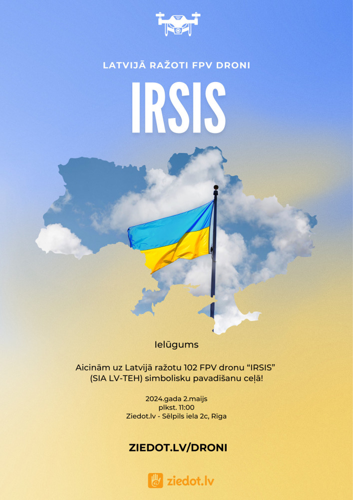 Atzīmējot Latvijas Neatkarības atjaunošanas gadadienu, Latvijas sabiedrība un uzņēmumi vēlas arī Ukrainai novēlēt brīvību - tādēļ Ukrainas aizstāvjiem tiek nosūtīti 102 Latvijā ražoti FPV droni “IRSIS”. FPV droni aprīkoti ar labas izšķirtspējas kamerām, plašu vadības kanālu daudzumu, kura darbības rādiuss ir 12-15 km. Kopējā sūtījuma vērtība sasniedz 97 tūkstošus eiro. Tie ir ziedojumi, kas pārvērtušies praktiskā un reālā palīdzība Ukrainas patruļpolicijas vienībai, Starptautiskajam leģionam un 3.brigādei.