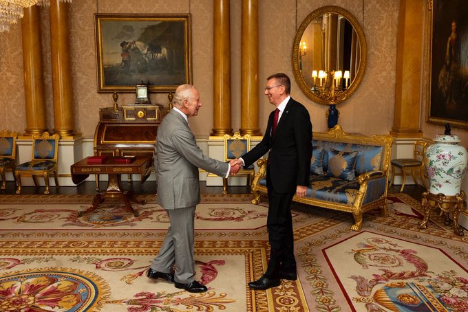 Vizītes laikā Lielbritānijā Latvijas prezidents Edgars Rinkēvičs uzņemts audiencē pie Lielbritājas karaļa Čārlza III Bekingemas pilī.