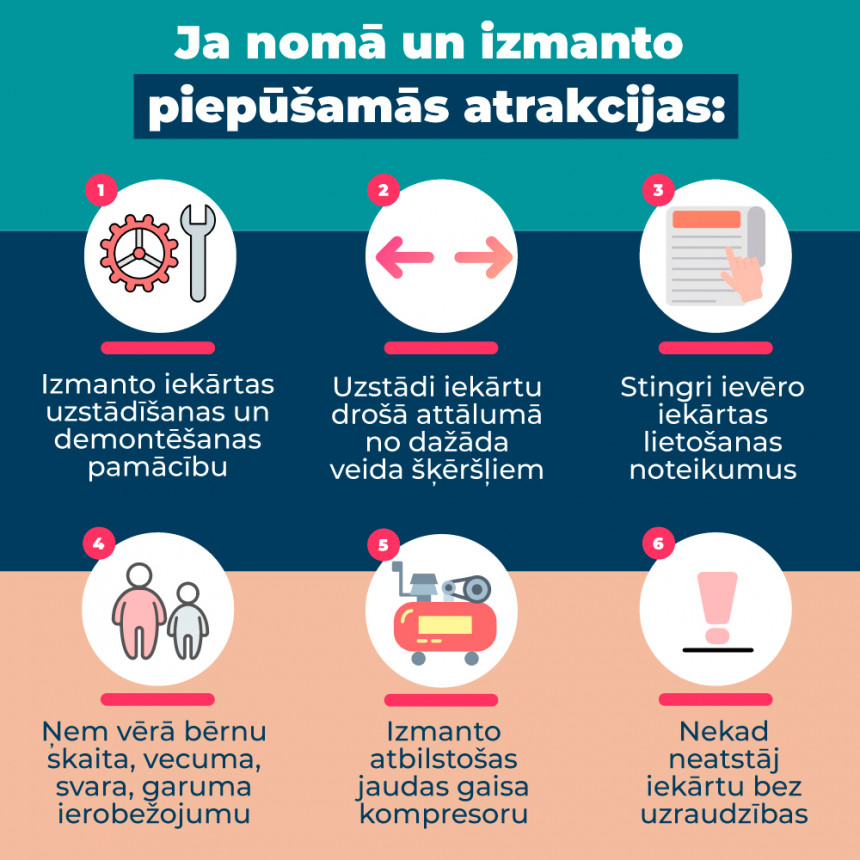 Pirms piepūšamās atrakcijas iznomāšanas pārliecinieties, ka komersants ir nodrošinājis visu nepieciešamo informāciju saistībā ar iekārtas drošu lietošanu: