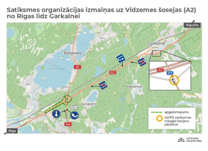 Uz Vidzemes šosejas (A2) satiksmes drošības uzlabošanas projekta ietvaros no 23. līdz 24. augustam slēgs divas apgriešanās vietas – aiz Langstiņiem (16,04. km) un pirms Garkalnes (19,71. km).