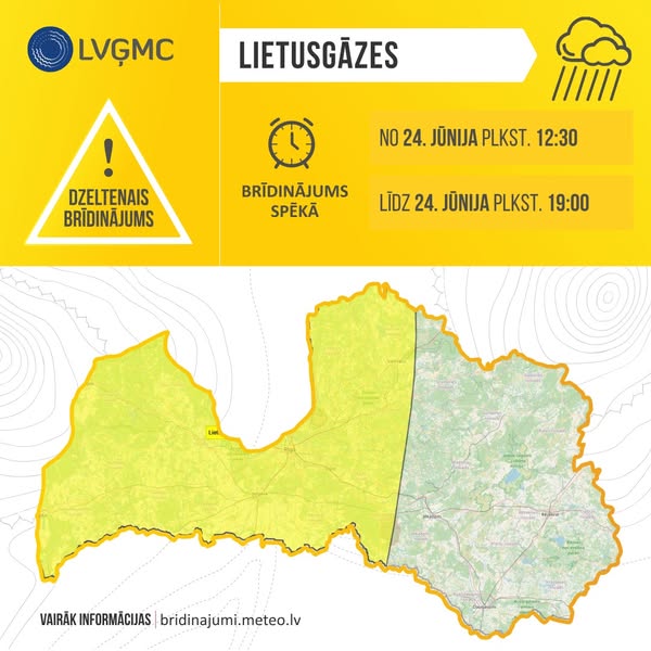 24.06. tuvākajās 1-3 stundās vietām rietumu un centrālajos rajonos gaidāmas stipras lietusgāzes ar nokrišņu daudzumu 10-19 mm.