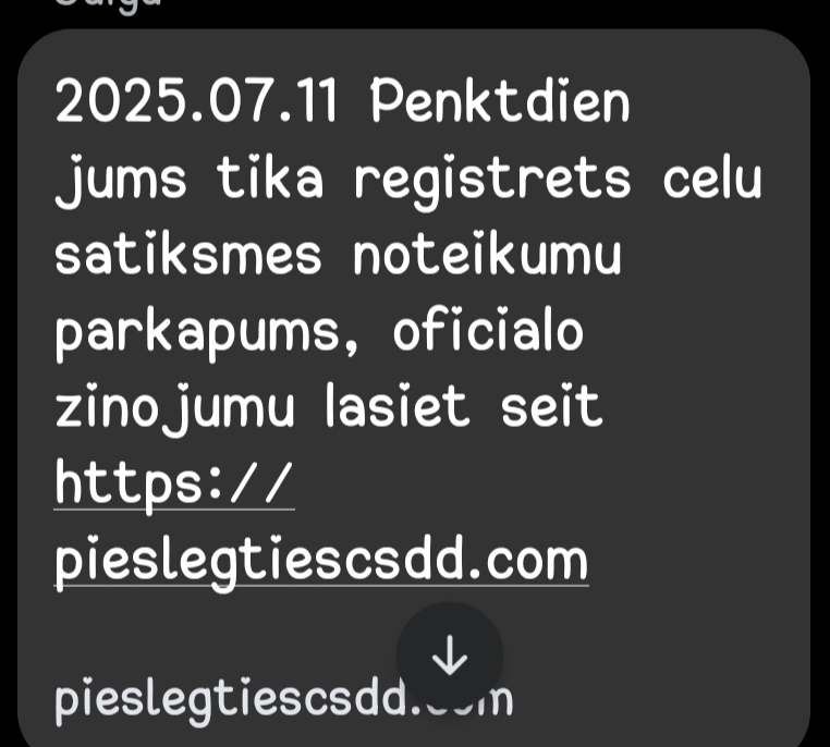 Brīdinām arī par mūsu kolēģu pieredzi - vairākiem no mums tika atsūtīta īsziņa it kā no DPD, kas apgalvoja, ka esot atnācis sūtījums, un pirms dažām dienām kādai no kolēģēm arī atsūtīja īsziņu no it kā CSDD ar saiti, kurai jāpieslēdzas, jo esot reģistrēts ceļu satiksmes negadījums.