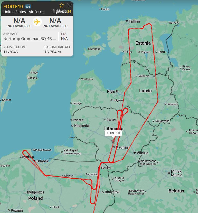 "Flightradar24" dati liecina, ka virs Baltijas valstīm un Polijas lokus met ASV bezpilota militārais izlūkošanas lidaparāts "FORTE10".