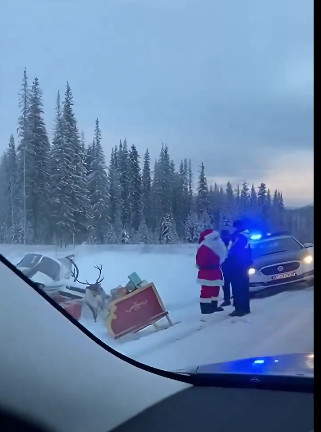 Ziemassvētku vecītis ar kamanām un ziemeļbriežiem nostūrējuši šosejas malā. Izskatās, ka sagāzušās kamanas.