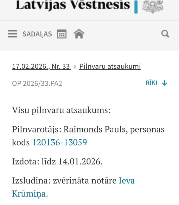 Maestro Raimonds Pauls atsaucis visas iepriekš izsniegtās pilnvaras, liecina 17. februārī oficiālajā izdevumā "Latvijas Vēstnesis" publicēts paziņojums.