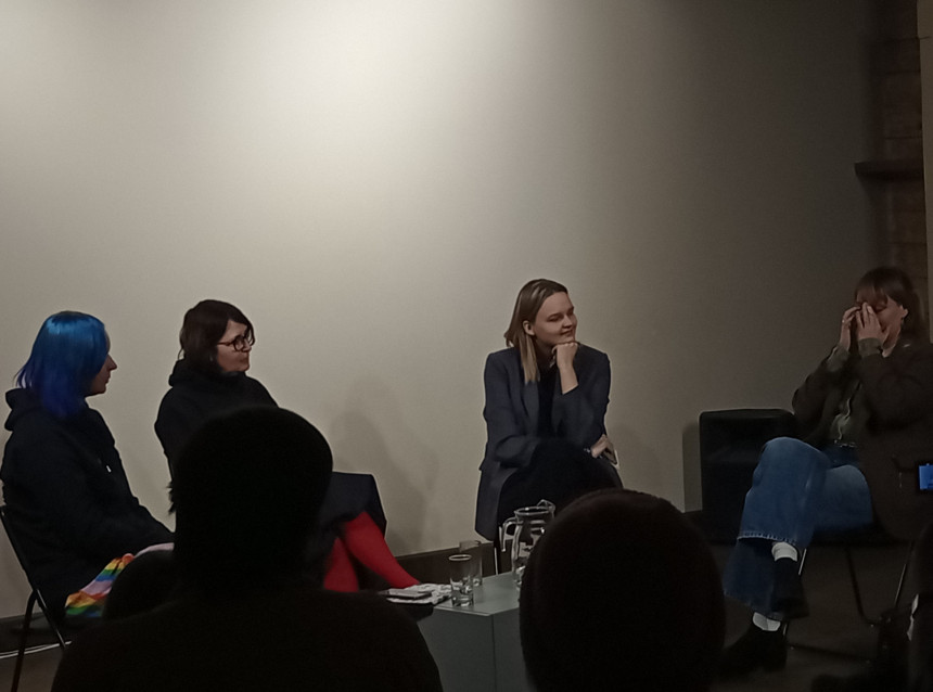Publiski diskutēja četras autores (attēlā no kreisās): Katrīna Rudzīte, Anna Auziņa, Agnese Radziņa, Agnese Krivade, kuras savos tekstos bieži pievēršas tēmām, kādas spēj aizsākt vienīgi sievietes, taču neziņoja par gadījumiem, kad feministiska pieeja Latvijā būtu tikusi bremzēta. Tāpat “kvīrbūšana” netika daudz apspriesta, jo šī tēma pati par sevi plašai sabiedrībai nav interesanta un saistoša. “Nenormatīvie ķermeņi” tā arī palika vien pasākuma aprakstā, jo Latvijā nevienam taču nav ienācis prātā jebkādos normatīvajos aktos noteikt, kādiem vajadzētu būt vai nebūt ķermeņiem. Migrācijas tēmai turpretī mūsu apstākļos ir pievērsta ievērojama sabiedrības uzmanība — pirmkārt jau no publiskās dienaskārtības nepazūd palīdzība ukraiņu bēgļiem, savukārt nelegālā migrācija tiek apspriesta plaši un daudzveidīgi. Kas bija domāts ar “eiblismu” un tā “kritiku”, tā arī palika noslēpumā tīts: acīmredzot šie nav plaši izplatīti jēdzieni, ko parāda fakts, ka tiem nav atrasti latviskie līdzinieki.