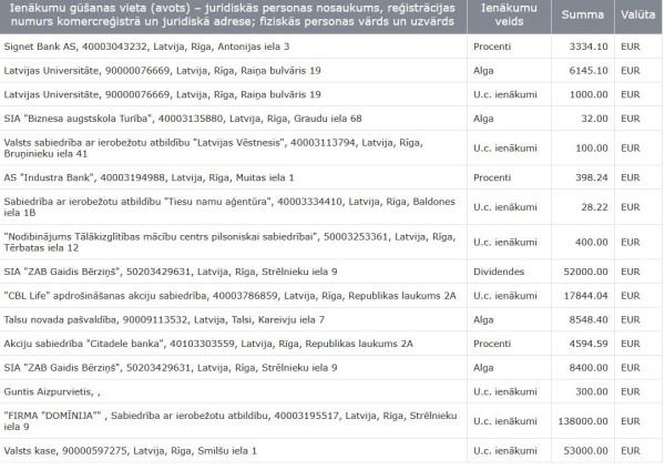 Ienākumu avoti daudz un dažādi (skat. attēlu), bet lielākie naudas riecieni par aizdevuma atgriešanu - 138 000 eiro, 52 000 eiro par dividendēm, no Valsts kases - 53 000 eiro (nosaukti kā citi ienākumi), "CBL Life" apdrošināšana izmaksājusi 17 800 eiro. Alga Talsu novada domē - 8500 eiro gadā. Teju tikpat daudz - 8300 eiro - saņēmis no bankām procentos.