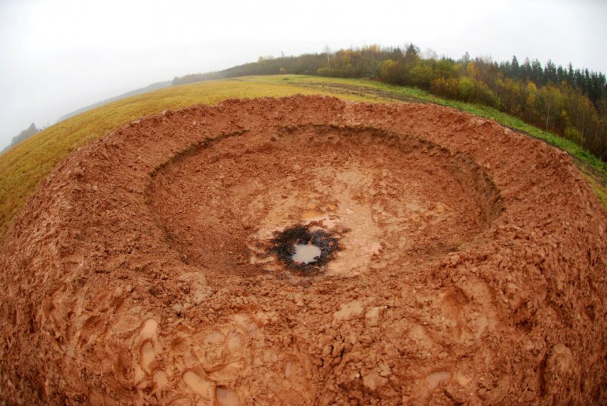 Kā aģentūrai LETA sacīja Ozols, kurš šorīt plkst.9 ieradies notikuma vietā, 10-12 metru platā bedre acīmredzami ir izrakta ar cilvēku rokām un tajā sadedzināts salpetris ar sēru.