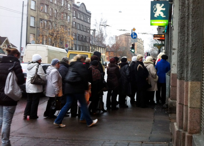 Pagājušajā nedēļā "Latvijas Krājbankas" klientiem pēc bankas darbības apturēšanas vairākas dienas bija ļauts izņemt 50 latu, kas veidoja garas rindas pie bankomātiem daudzviet Latvijā.