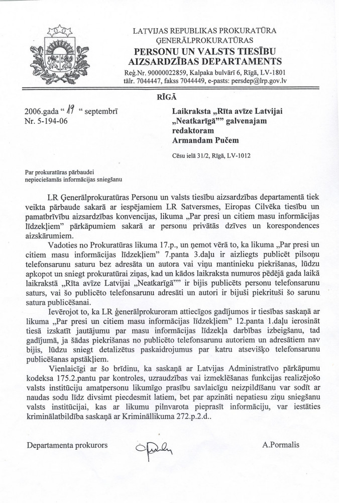 Minētais civiltiesas spriedums ir krasā pretrunā ar Ģenerālprokuratūras prokurora Agņa Pormaļa 2006. gada vasarā Neatkarīgajai izteikto skarbo brīdinājumu par telefona sarunu publiskošanas nepieļaujamību.