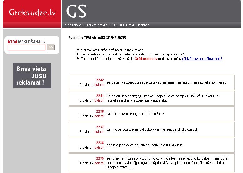 Jau labu laiku Latvijā darbojas gan virtuālā e-baznīca, gan katoļu un luterāņu baznīcu mājas lapas, bet pirms mēneša Latvijā parādījusies arī virtuālo grēksūdžu mājas lapa, kurā ikviens pavisam anonīmi var izstāstīt savus visslēptākos grēkus. Tiesa, izrādās, ka šos grēkus neviens mācītājs nepārlasa un neatlaiž, jo portāla veidotāji šo lappusi iecerējuši vairāk kā atpūtu un izklaidi.