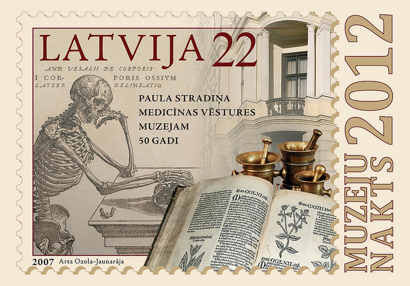 Tāpēc, atsaucoties Medicīnas vēstures muzeja aicinājumam, Latvijas Pasts 2012.gada Muzeju naktij izdevis īpašas pastkartes par šo tēmu, un tās muzejā no plkst.19 līdz 24 varēs gan iegādāties, gan apzīmogot ar speciālu Muzeju nakts zīmogu, gan arī nosūtīt. Muzeju naktī Medicīnas vēstures muzejā būs aplūkojama arī pati A.Vezālija grāmata, kurā ietvertais cilvēka skeleta atainojums ir pamatā Latvijas Pasta izdotajai pastmarkai.