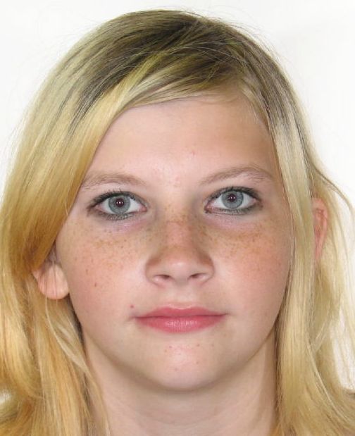 Meitenes augums 160 centimetri, acis- zilas, mati-balināti balti pāri pleciem, zem acīm vasaras raibumi. Uz kreisās rokas vidējā pirksta rēta 2 cm.