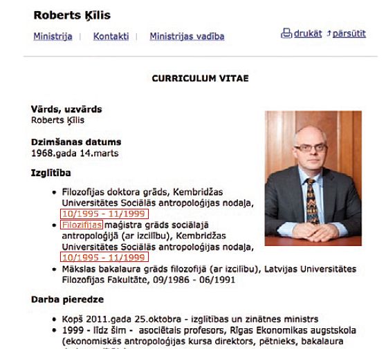 Acīmredzot kļūmīgais CV ministrijas mājaslapā atrodas jau kopš Roberta Ķīļa stāšanās amatā, taču kļūdas nav izlabotas arī vairākas dienas pēc tam, kad Neatkarīgā vērsa uz tām ministra biroja uzmanību. Līdztekus pārrakstīšanās kļūdām, kas, piemēram, ministru iecēlušas filozifijas maģistra kārtā, te izlasāms, ka Roberts Ķīlis paralēli maģistra grādam sociālajā antropoloģijā ieguvis arī doktora grādu. Mācījies vienlaikus abās programmās, kas apjoma ziņā un arī no procesa organizācijas viedokļa būtu teju neiespējami. Kā vēsta CV, šis akadēmiskais varoņdarbs noticis laika posmā no 1995. gada oktobra līdz 1999. gada novembrim Kembridžas universitātē. Taču CV vēsta aplami.