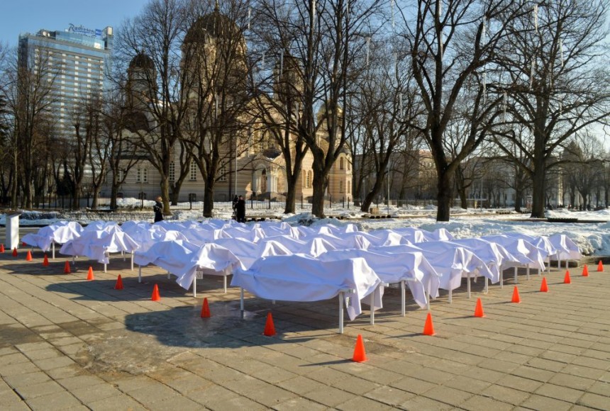 Par dramatisko situāciju Rīga, Esplanādē, akcijas laikā atgādinās 34 ar palagiem apsegtu cilvēka ķermeņu atveidojumi.