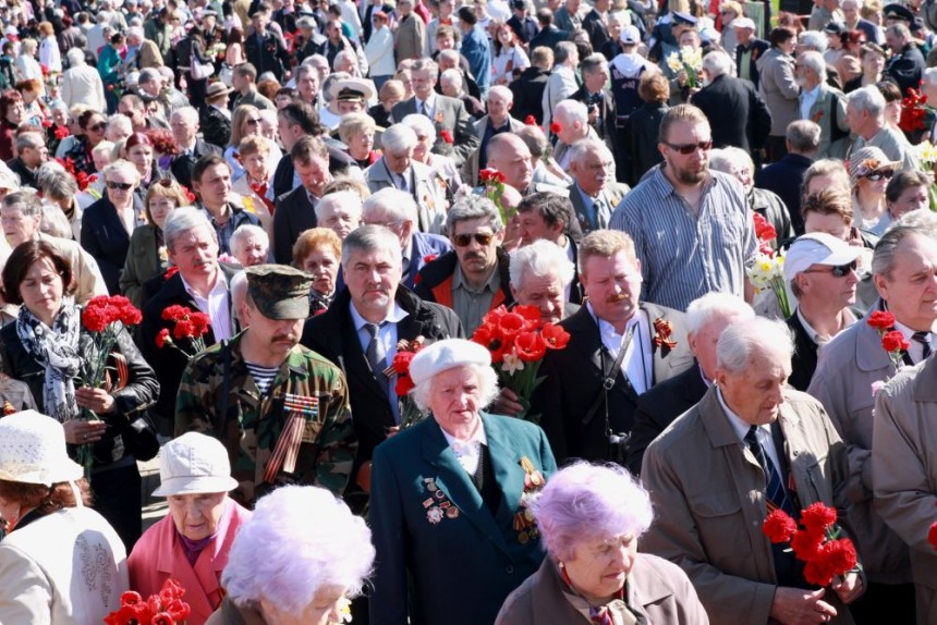 Uz svinībām ir ieradušies arī padomju armijas veterāni, daļa no viņiem kupli greznojušies ar apbalvojumiem. Daudzi klātesošie - jauni un veci - pie sava apģērba piesprauduši melni oranžās lentītes.