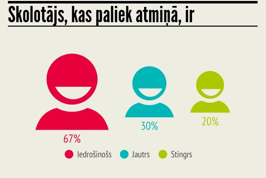 71% Latvijas iedzīvotāju atzīst, ka labs skolotājs ir tas, kas savu darbu dara ne vien ar prātu, bet arī ar sirdi, norādot, ka skolotājs ir vairāk nekā profesija – tas ir dzīves stils. Vislielāko ietekmi, kā atzīst 67% aptaujāto, uz skolēna turpmāko dzīvi atstāj skolotāji, kas iedvesmo un motivē, taču īpašu atzinību par atstāto iespaidu uz nākotnes profesijas izvēli un dzīves gājumu izpelnās latviešu valodas skolotāji, ko kā svarīgu personu atzīmēja 18% iedzīvotāju, matemātikas (15%) un sporta (11%) skolotāji. Tā secināts Samsung Skola nākotnei veiktajā aptaujā, kas ir veikta Skolotāju dienas ietvaros*.