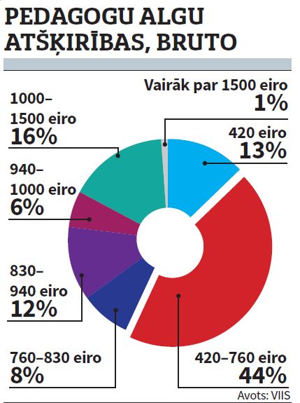 Pedagogu vidējais atalgojums ir 723 eiro (bruto), un puse no visiem pedagogiem saņem vairāk par 703 eiro, aprēķinājusi Izglītības un zinātnes ministrija (IZM), pamatojoties uz VIIS. Tomēr, atsevišķi ņemot, aina nav tik viendabīga: 13% pedagogu ik mēnesi tiek maksāti tikai 420 eiro. Pamatā tie ir darbinieki (interešu izglītības skolotāji, logopēdi, psihologi un citi speciālisti), kuri izglītības iestādēs strādā nepilnu darba slodzi. Mazāk par jaunajā modelī paredzēto slieksni 760 eiro par vienu amata likmi šajā mācību gadā, pēc pašreizējiem izglītības iestāžu datiem, ir aptuveni pusei pedagogu, secina IZM. Jāpiebilst, ka lielāko daļu finansējuma algām sastāda valsts piešķirtās mērķdotācijas: 77%, pašvaldību piemaksas – 22% un 1% privātās investīcijas.