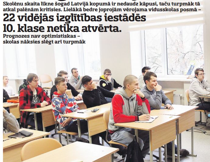 Skolēnu skaita līkne šogad Latvijā kopumā ir nedaudz kāpusi, salīdzinot ar iepriekšējo gadu, taču turpmāk tā atkal palēnām kritīsies, ko rāda sarūkošais pirmsskolas audzēkņu posms. Lielākā bedre joprojām vērojama vidusskolas posmā – ne velti 22 vidējās izglītības iestādēs 10. klase netika atvērta. Arī tuvāko gadu prognozes optimistisku ainu nerāda, kas nozīmē – skolas nāksies slēgt arī turpmāk.