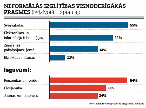Līdz šim pieaugušo izglītībā iesaistījies neliels skaits Latvijas iedzīvotāju – tikai 5,7%. Līdz 2020. gadam šo skaitli paredzēts audzēt līdz 20%. Viens no ieročiem – šogad sāktais sešu gadu ilgais un 25 miljonus vērtais projekts Eiropas Savienības (ES) programmā Izaugsme un nodarbinātība. Tajā akcents tiks likts uz strādājošo kompetences palielināšanu četrās nozarēs.