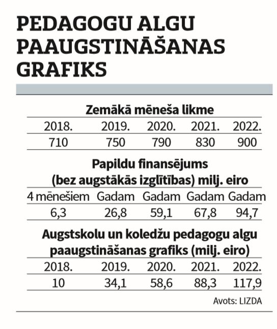 Jaunajā mācību gadā pedagogu minimālais atalgojums tiks palielināts no 680 līdz 710 eiro par likmi. Lai nodrošinātu šādu kāpumu četros mēnešos, no valsts budžeta tas papildus prasīs aptuveni 6,4 miljonus eiro. Turpmāk noteiktā darba samaksa plānota vēl lielāka - ik gadu plus 40 eiro, 2022. gadā sasniedzot 900 eiro par likmi, un tam kopumā būs vajadzīgi vairāk nekā 250 miljoni eiro. Jāpiebilst, ka augstskolu un koledžu pasniedzēju algu indeksācijai tādam pašam periodam ir nepieciešami vēl papildu 370 miljoni eiro. Šogad 1. janvārī šim mērķim tika piešķirti 3,7 miljoni eiro.
