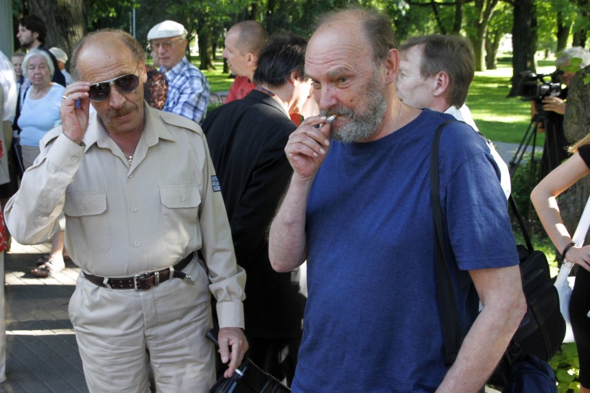 Pirms mītiņa LKS līderi Tatjana Ždanoka un Miroslavs Mitrofanovs sanākušajiem organizēti izdalīja neliela izmēra, visticamāk, bērnu zīmējumus.