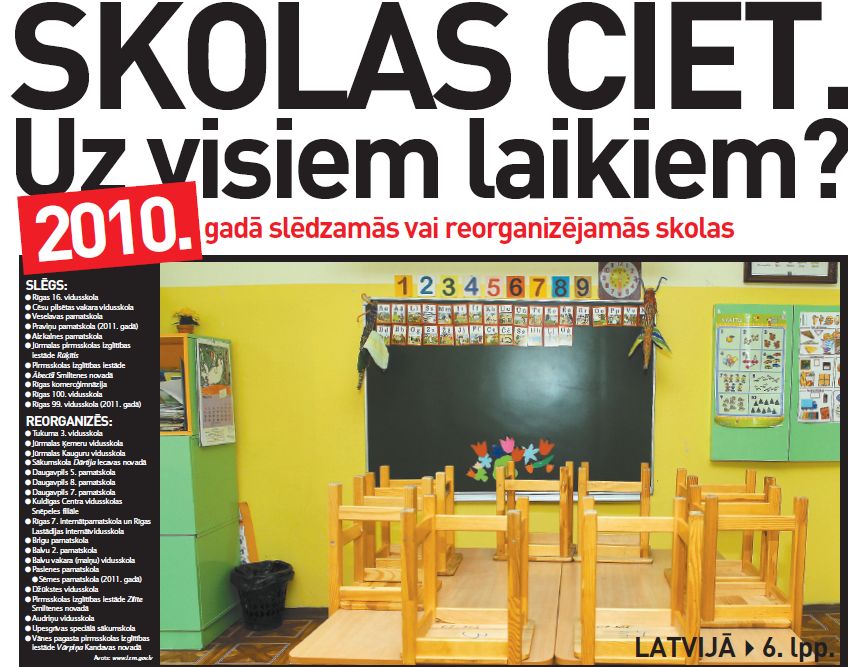 Reorganizācija šogad skars četras reizes mazāk skolu nekā pērn. 2010. gadā IZM ir saskaņojusi 19 izglītības iestāžu reorganizāciju. Sarakstā iekļautās skolas plānots apvienot vai pārveidot, piemēram, vidusskolas vietā atstājot tikai pamatskolu.