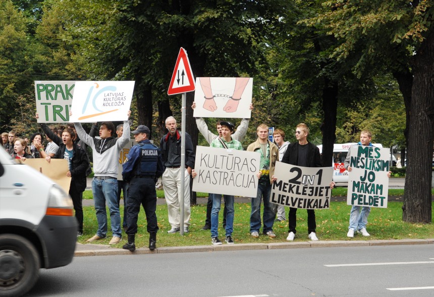 „Mēs gribam atbildes”, „Katram savas mājas”, „Nesūti kultūru trimdā”, „Nebūs režisoru, nebūs dziesmu svētku” – ar šādiem saukļiem un plakātiem rokās jaunieši protestēja, cerot, ka viņu neapmierinātību sadzirdēs un uzklausīs. Uz sarunu ar LKK studentu pašpārvaldes prezidentu Mārci Benužu no Ministru kabineta iznāca KM valsts sekretāra vietnieks Reorganizācijas darba grupas vadītājs Uldis Lielpēters. Viņš pauda prieku, ka studenti ir savas skolas patrioti, taču norādīja, ka līdz galam nav saprasta šodien pieņemtā MK lēmuma jēga. „Kultūras koledžā netiek apvienota un nezaudē savu patstāvību. Gluži otrādi – no KM padotības tā tiek pārlikta LKA sistēmā. Tātad daudz profesionālākā vidē attiecībā uz izglītības satura jautājumiem. Turklāt tai tiek piešķirts aģentūras statuss, kas nozīmē daudz lielāku patstāvību nākotnē, nekā līdz šim,” paskaidroja U. Lielpēters.