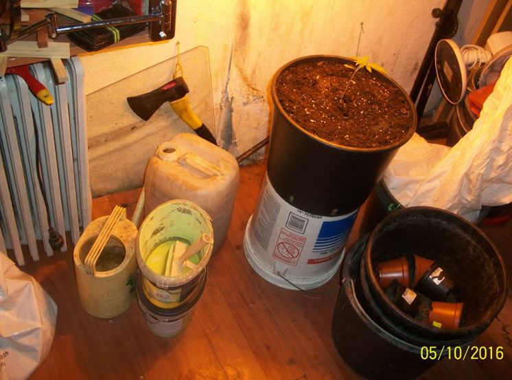 Policisti paņemot plēvi malā, pamanīja neliela izmēra telpu, kura bija aprīkota ar lampām, sildītāju, ventilāciju un stalažām. Zem ieslēgtām lampām atradās puķu pods ar zaļu augu, bet pie sienām bija piekārti divi šaujamieročiem līdzīgi priekšmeti.