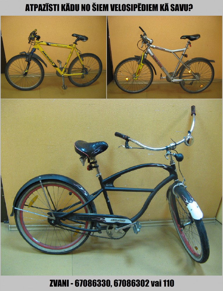 Valsts policijas Rīgas reģiona pārvaldes Rīgas Latgales iecirkņa policisti pēdējo mēnešu laikā no vairākām personām atsavinājuši trīs velosipēdus, kuru īpašnieki nav noskaidroti.