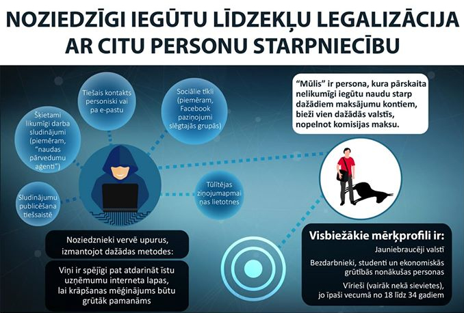 “Naudas mūļi” ir personas, ar kuru starpniecību noziedzīgās grupas pārvieto un legalizē noziedzīgi iegūtus līdzekļus. Noziedznieku savervētais “mūlis” pārskaita nelikumīgi iegūto naudu starp dažādiem maksājumu kontiem, nopelnot komisijas maksu. Visbiežāk par šādu shēmu dalībniekiem kļūst personas, kas nonākušas ekonomiskās grūtībās, tostarp bezdarbnieki un studenti. Taču, lai kādu apsvērumu dēļ personas iesaistījušās šādos darījumos, būtiski apzināties, ka tas ir nelikumīgi un nezināšana neatbrīvo no atbildības.