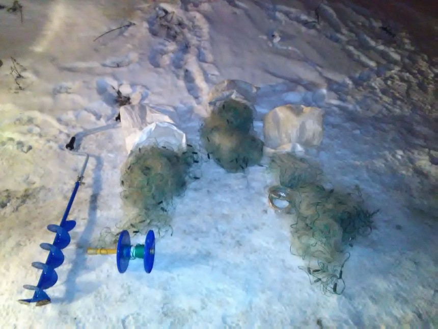 Abas personas bija ģērbušās baltās drebēs, lai uz ledus būtu grūti pamanāmas. Policisti uzvilka glābšanas vestes un lēnām gar krastu sekoja sniegā atstātajām pēdām. Drīz vien likumsargi nonāca pie abām personām. Blakus vīriešiem atradās urbis un divi maisi, kuros bija divi nelegāli zvejas tīkli. Sarunas laika vīrieši atzinās, ka vēlējušies āliņģī ielikt nelegālos zvejas rīkus.
