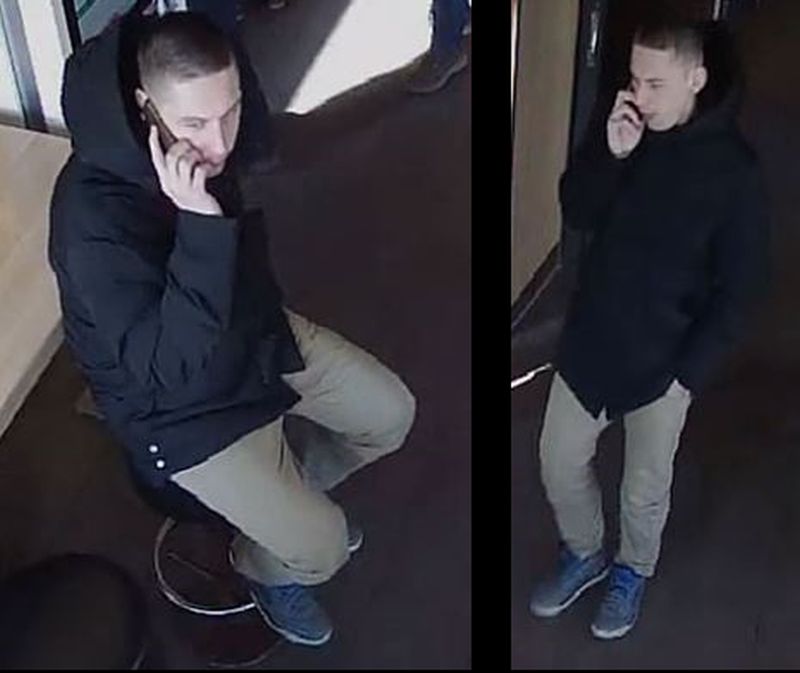 Videonovērošanas kameras ir fiksējušas, kā attēlā redzamais jaunietis apsēžas pie galda, kur iepriekš sēdējis datora īpašnieks, pamana datoru, paņem to un aiziet projām.