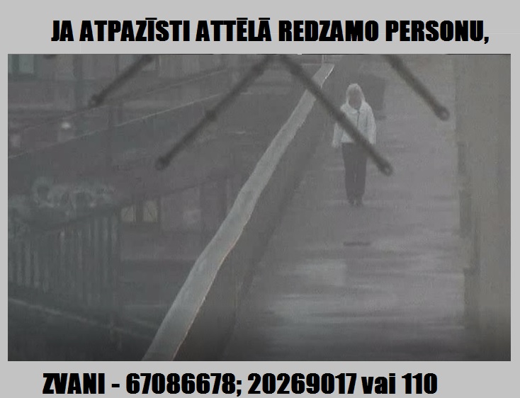Valsts policija izmeklēšanas ietvaros lūdz iedzīvotāju palīdzību attēlā redzamās sievietes atpazīšanai un informācijas sniegšanai par šo personu. Pazīmes pēc attēla: vidējas miesasbūves, blondi mati līdz pleciem, apmēram 30-40 gadus veca. Ģērbusies baltā, īsā vējjakā, melnās klasiskās biksēs.