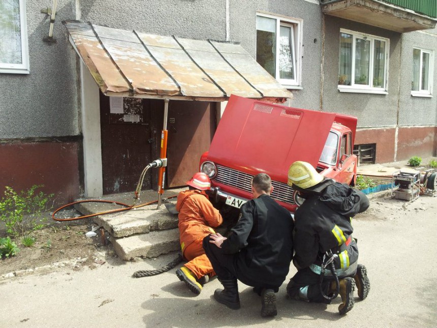 Ugunsdzēsēji ieradās notikuma vietā un konstatēja, ka negadījumu izraisījis sarkans žigulis, kas pēc ietriekšanās nojumes konstrukcijās bija krietni apskādēts. VUGD darbinieki automašīnu atbrīvoja un nojumi noņēma, lai tā neapdraudētu mājas iedzīvotājus.