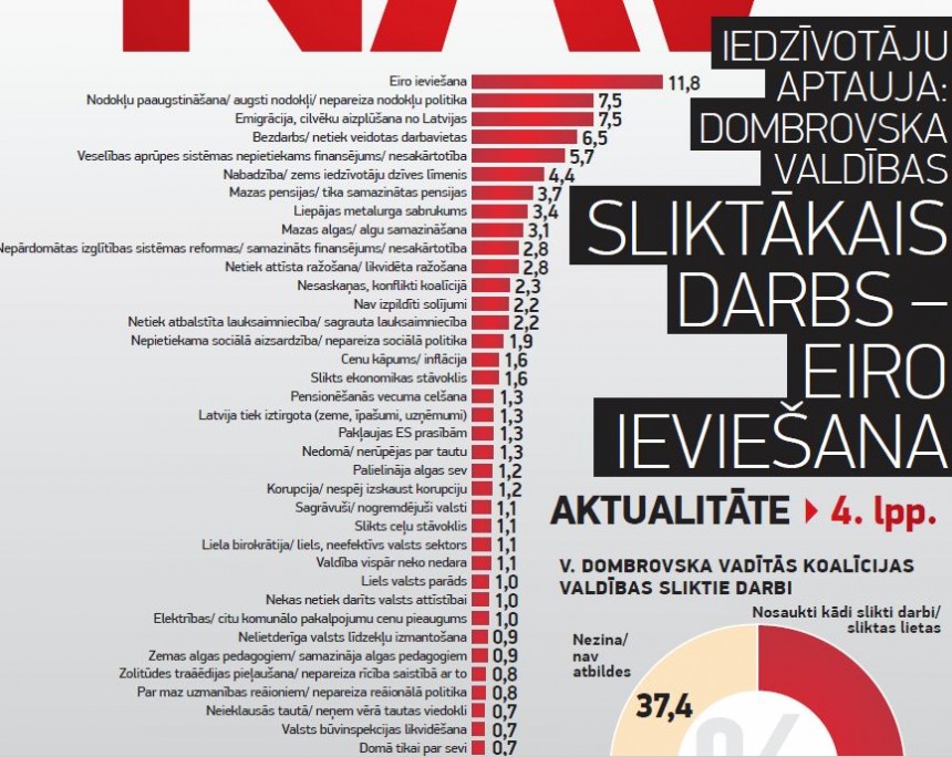Gluži vai kā labi skolēni 10,5% aptaujāto atkārtojuši V. Dombrovska un viņa partijas biedru «dižpārdokli» par to, kā V. Dombrovska valdība valsti izveda no krīzes. Vienlaikus tieši krīzes lēmumi dominē V. Dombrovska valdību slikto darbu uzskaitījuma galvgalī uzreiz pēc eiro ieviešanas: nodokļu paaugstināšana, nepareiza nodokļu politika, tādu lēmumu pieņemšana vai nepieņemšana, kas mūsu cilvēkus dzina emigrācijā (7,5% aptaujāto), kā arī bezdarbs un jaunu darba vietu neveidošana (6,5%).