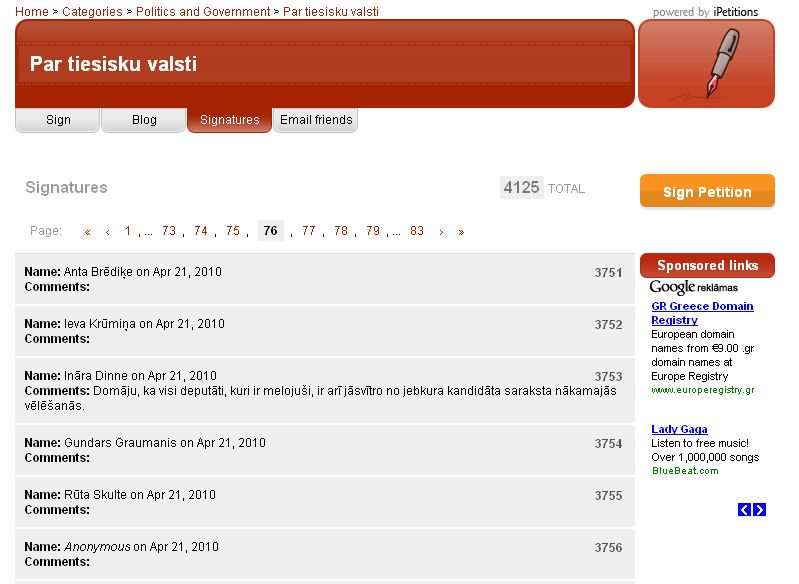 Publikācijas tapšanas brīdī interneta vietnē bija norādīts, ka zem petīcijas dažādus viedokļus paudušas vairāk nekā 4000 personas. 21. aprīlī LETA ziņoja, ka Valsts prezidentam Valdim Zatleram un I. Bičkovičam iesniegtas 3700 iedzīvotāju parakstītas petīcijas "par Jāņa Maizīša kandidatūras atkārotu virzīšanu ģenerālprokurora amatam". To, ka starp amatpersonām iesniegtajiem parakstiem rodami arī augšminēto viedokļu paudēji, anonīmie parakstītāji, vairākkārt parakstījušies un juridiskās personas, petīcijas iesniedzēji noklusējuši.