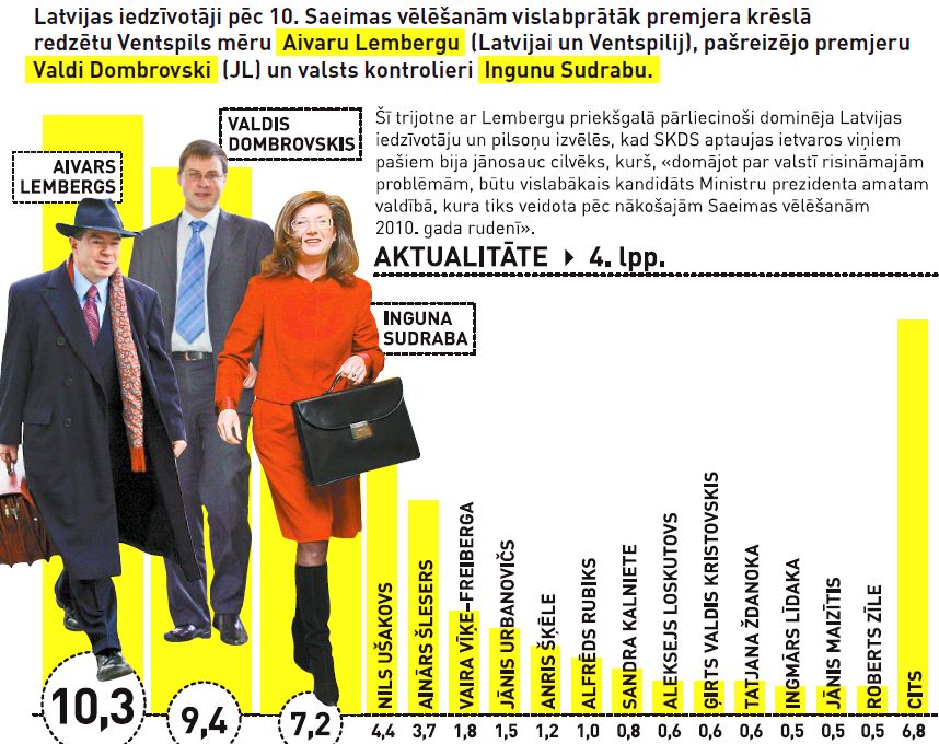 Latvijas iedzīvotāji pēc 10. Saeimas vēlēšanām vislabprātāk premjera krēslā redzētu Ventspils mēru Aivaru Lembergu (Latvijai un Ventspilij), pašreizējo premjeru Valdi Dombrovski (JL) un valsts kontrolieri Ingunu Sudrabu.