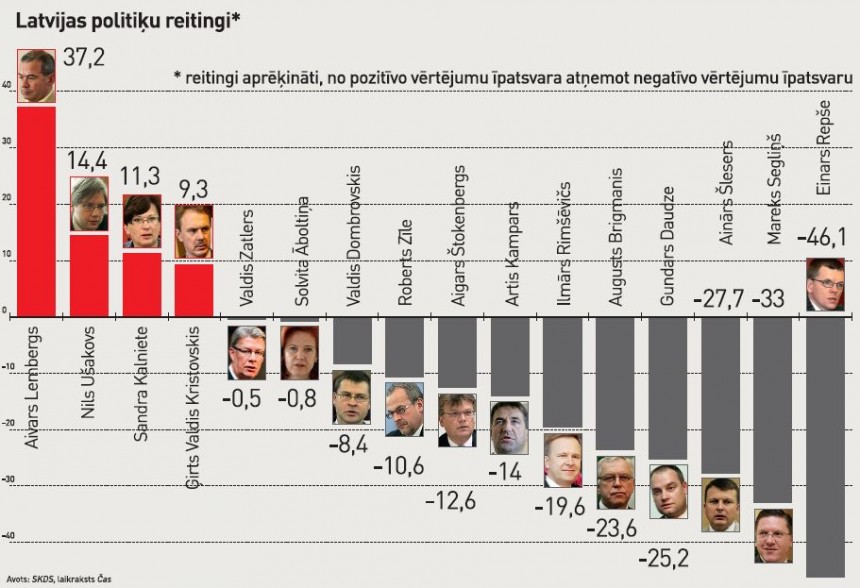 Valsts prezidentam Valdim Zatleram tas ir mīnuss 0,5 punkti, Jaunā laika līderei Solvitai Āboltiņai – mīnuss 0,8, bet, piemēram, priekšvēlēšanu laikā popularitāti baudījušajam Rīgas vicemēram Aināram Šleseram (LPP/LC) – mīnuss 27,7. Viszemākā sabiedrības uzticība gan ir par valsts budžeta griezieniem atbildīgajam finanšu ministram Einaram Repšem, kuram reitings ir mīnus 46,1 reitinga punkts. Pozitīvi viņu novērtējuši tikai 20% aptaujāto, bet negatīvi – 66,3% aptaujāto.