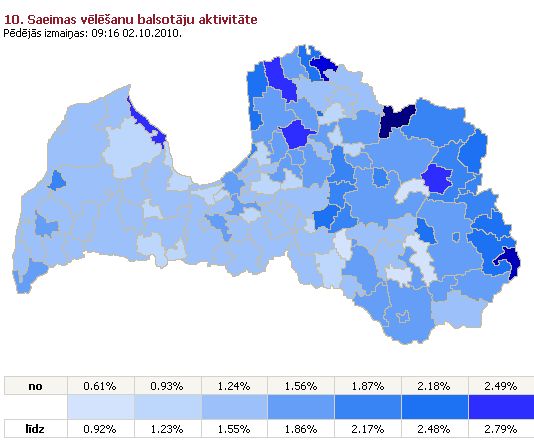 Rīgas vēlēšanu apgabalā nobalsojuši 6504 vēlētāji jeb 1,59%, Vidzemes apgabalā - 6662 vēlētāji jeb 1,64%, Latgales apgabalā - 4231 vēlētājs jeb 1,77%, Kurzemes apgabalā - 2856 vēlētāji jeb 1,39%, bet Zemgales apgabalā - 3326 vēlētāji jeb 1,43%.