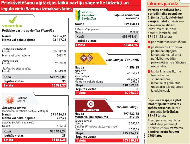 Otri lielākie izdevumi iekļūšanai Saeimā bijuši Saskaņas centram (SC) – gandrīz 20 000 latu par katru no 29 vietām. Zaļo un zemnieku savienībai (ZZS) šīs vēlēšanas izmaksājušas 18 361 latu par vienu no 22 vietām, savukārt vēlēšanu uzvārētājiem Vienotībai katrs no iegūtajiem 33 deputātu krēsliem izmaksājis nepilnus 16 000 latu. Vismazākie izdevumi gandrīz 15 000 latu par vienu no astoņām deputātu vietām bijuši nacionālajai apvienībai VL!–TB/LNNK.