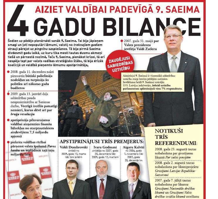 Šodien 9. Saeima sanāk uz pēdējo plenārsēdi. Tās priekšsēdētājs līdzīgi kā virkne citu politiķu nekautrējas samierināties ar skaudro realitāti – parlaments četru gadu laikā ir zaudējis sabiedrības uzticību. "Vērtējot 9. Saeimas darbu, jāņem vērā, ka šis ir pirmais parlaments, kas kopš Augstākās padomes laikiem strādājis ekonomiskās lejupslīdes apstākļos. Tāpēc arī 9. Saeima noteikti ir viens no vispretrunīgāk vērtētajiem sasaukumiem atjaunotās Latvijas Republikas laikā," saka 9. Saeimas priekšsēdētājs Gundars Daudze.