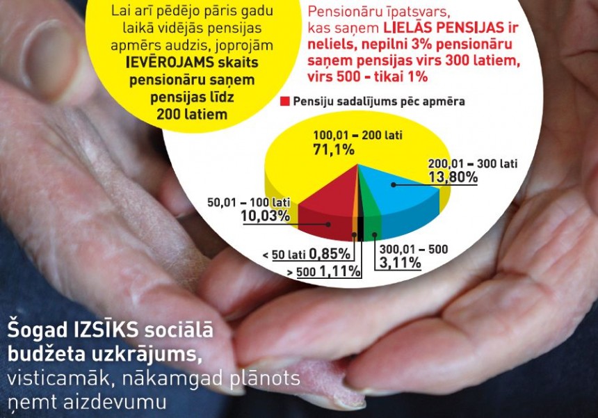 Lai arī pēdējo pāris gadu laikā vidējās pensijas apmērs audzis, joprojām ievērojams skaits pensionāru saņem pensijas līdz 200 latiem, tas ir vairāk nekā 70% no pensiju saņēmējiem. Tas nozīmē tuvu tā sauktajam iztikas minimumam. No otras puses, ievērojama sabiedrības daļa pašlaik algā saņem vien minimumu – 200 latus pirms nodokļu nomaksas.