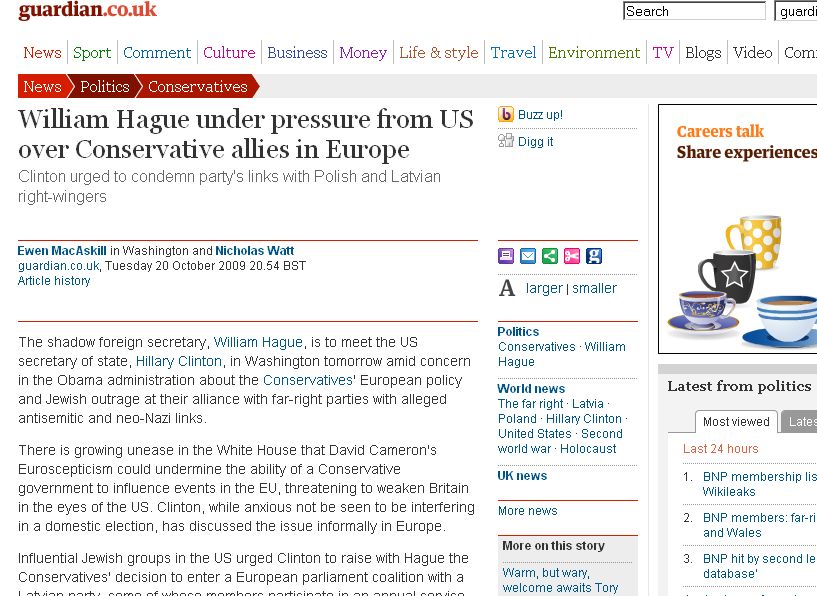 Šai partijai britu prese pēdējo mēnešu laikā piedēvējusi antisemītismu un nacistu slavināšanu. Ietekmīgās ebreju organizācijas vērsušās pie ASV valsts sekretāres Hilarijas Klintones, mudinot viņu pārrunāt toriju "antisemītiskās saiknes", trešdien tiekoties ar Viljamu Hāgu, kuram prognozē Lielbritānijas ārlietu ministra amatu pēc toriju gaidāmās uzvaras vēlēšanās pavasarī. Britu laikrakstam The Guardian otrdien šis fakts un vairāku anonīmu diplomātu teiktais ļāvis rakstīt par "ASV spiedienu" uz torijiem par to sabiedrotajiem Eiropā. ASV un Lielbritānijas attiecību līmenī šis jautājums pārnests ar argumentu, ka Vašingtona it kā esot nobažījusies par Lielbritānijas ietekmes mazināšanos Eiropas Savienībā pēc tam, kad pie varas, kā tiek prognozēts, nāks toriji. Tādējādi Lielbritānija zaudētu savas galvenās ASV sabiedrotās lomu Eiropā, savukārt bažījas britu analītiķi. Tas, ka toriji, vairāk nekā desmit gadus neesot pie varas, ir zaudējuši kompetenci ārlietās, ko apliecinot lēmums izstāties no ietekmīgās Eiropas Parlamenta Tautas partiju grupas un bloķēties ar Austrumeiropas nacionālkonservatīvajām partijām tādām kā TB/LNNK, tiek izmantots kā viens no nedaudzajiem argumentiem, lai šo partiju sistu britu iekšpolitiskajā cīņā.