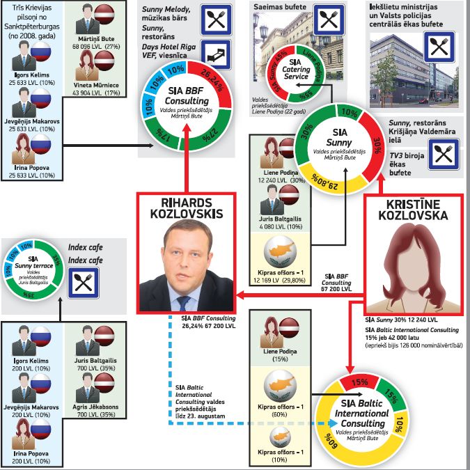 Diezgan ātri parādījās neoficiāla informācija, ka firma ir cieši saistīta ar jaunpienācējiem politikā un Augstajā namā – «tiesiskuma etalonu» Zatlera Reformu partiju (ZRP). Izejot cauri Catering Service visai sarežģītajiem radurakstiem (skat. shēmu), atklājās, ka firma pastarpināti pieder ZRP virzītā iekšlietu ministra Riharda Kozlovska sievai Kristīnei. Savukārt ņemot vērā to, ka Kristīne Kozlovska savulaik savam vīram Rihardam Kozlvskim vienkārši atdevusi SIA BBF Consulting (arī darbojas ēdināšanas biznesā) kapitāla daļas 67 200 latu nominālvērtībā, var secināt, ka abi ģimenes locekļi biznesā darbojas vienlīdz atbildīgi. Turklāt, lai gan uzņēmumi ir vairāki, Kozlovsku ģimenes un viņu partneru bizness ir cieši integrēts un to zīmols ir Sunny. Firma ar šo zīmolu vairākus gadus apkalpo arī