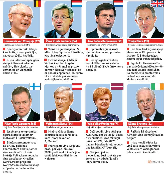 Apliecinājumi, ka V. Dombrovska centieni lobēt eksprezidentes kandidatūru ir nesuši kādus reālus augļus, nenāk arī no premjera biroja. Aizvadītajā nedēļā eiropadomes sēdē Briselē premjers V. Vīķes-Freibergas kandidatūras lobēšanai izmantoja arī neformālu sarunu iespēju, ko deva sēdēšana pie vakariņu galda starp Vācijas kancleri Angelu Merkeli un Francijas prezidentu Nikolā Sarkozī, kuru ietekmei ir noteicoša loma vienošanās panākšanā.