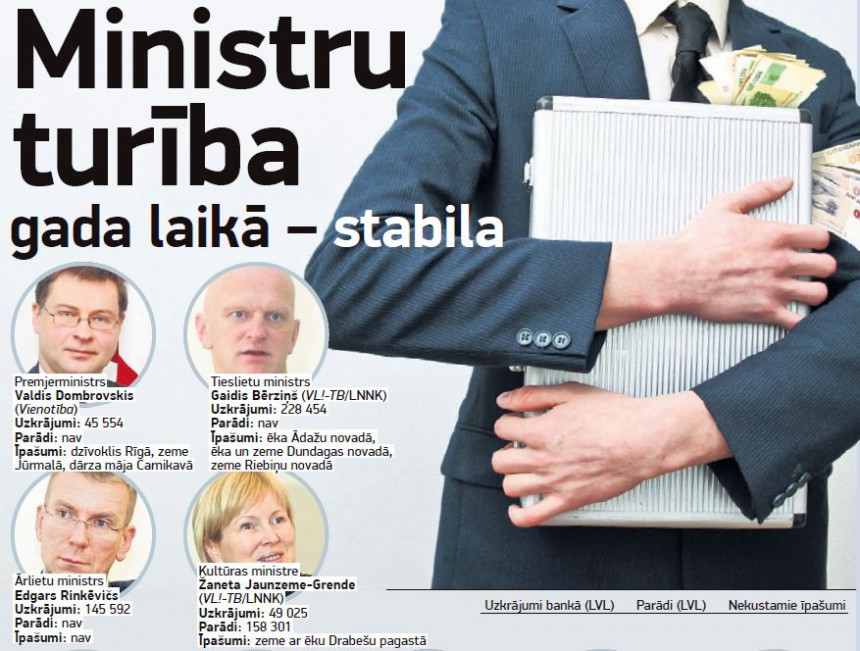 Par turīgāko ministru, ja vērtē pēc naudas uzkrājumiem un izsniegtajiem aizdevumiem, uzskatāms tieslietu ministrs Gaidis Bērziņš, bet visa Ministru kabineta vērtība pārsniedz pusmiljonu latu.