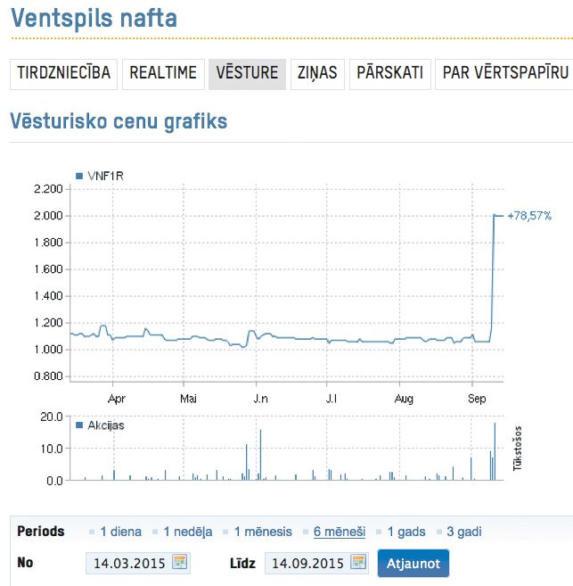 Lai saprastu, par kādām vērtībām šeit tiešām ir runa, piemēram, var veikt elementāru aprēķinu. 43,25 procenti Ventspils naftas kapitāla ir 45 187 390 akcijas. Lai nopirktu šādu daudzumu akciju par biržas cenu, tad pagājušās nedēļas beigās (katra akcija maksāja apmēram 1,20 eiro) pircējam būtu jāmaksā 54,2 miljoni eiro. Savukārt šo pirmdien pusdivpadsmitos (pirmais pirmdienas darījums ar Ventspils naftas akcijām bija par cenu 2,41 eiro) pircējam būtu jāšķiras jau no 109 miljoniem eiro.